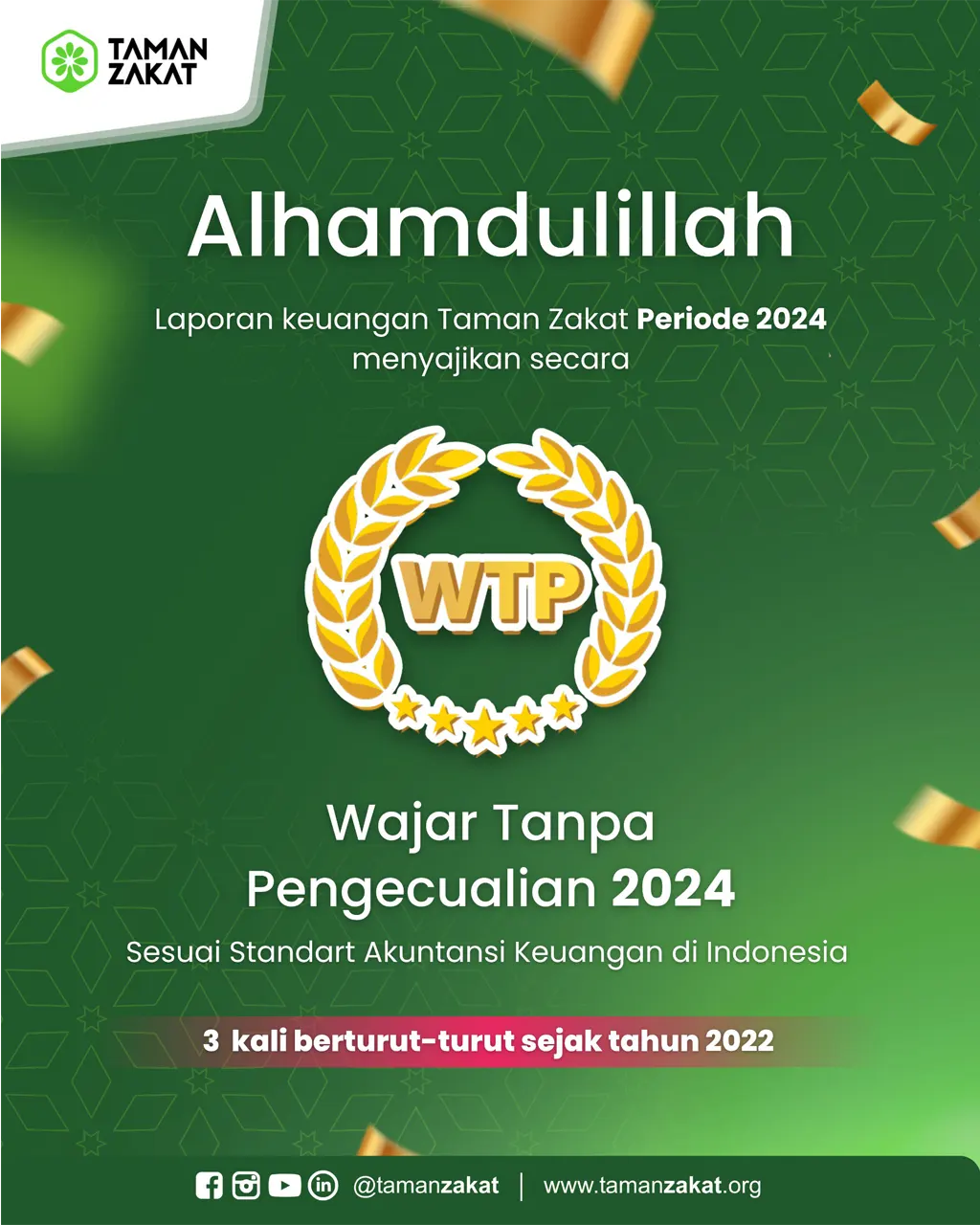 Prestasi Kami meraih predikat Wajar Tanpa Pengecualian (WTP) 2024 menunjukkan komitmen kuat Kami dalam mengelola amanah dengan baik.